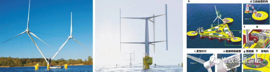 比如左图中的多叶轮风电机组。多叶轮风电机组是指几台风电机组共用一个平台。中图是漂浮式垂直轴风电机组,它与传统水平轴之前最本质的一个区别是它在运作时没有风向要求,可以360度随便吹。而大型的水平轴对风向是有严格的要求的,大家可以观察到它的机舱上有一个风速风向测量仪作为对风装置,对着风吹时发电量会比较高。右图是风能、太阳能、波浪、储能结合到一起的新型发电装置。不过这个装置还是处于概念阶段或者说样机研制阶段。