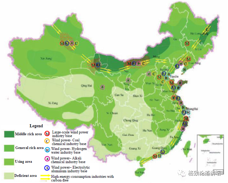 这张版图展示了我国的风资源分布情况。我国的风资源主要集中在东北、西北、华北的“三北”地区与东南沿海地区,呈“人”字形分布。风电场也主要集中在这些高风速区。
