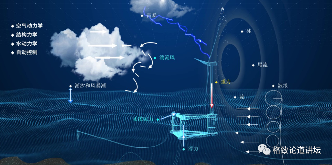 漂浮式风电是一个强非线性的多物理场耦合系统。它涉及很多不同学科,有空气动力学、结构力学、水动力学,还有自动控制,是一个多学科交叉的复杂系统。