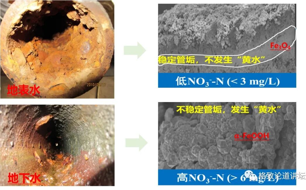 我们就发现,当管网是通地表水的时候,管道它本身就能产生一个比较致密的管垢。这种致密的管垢比较稳定,即使是河北水来,它也不会释放出黄水。但是以前用的是地下水的管道,它的管垢比较稀薄,不能形成致密的管垢,也就不能形成保护。所以通地下水的管道,是导致黄水产生的一个主要的原因。