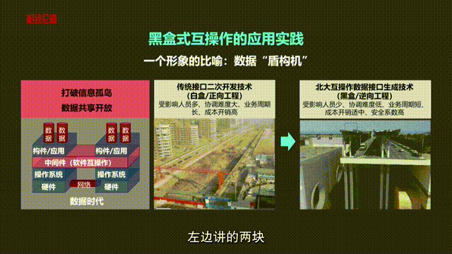 图中的左边的两个图就是传统的白盒方式。做一个形象地比喻,黑盒式互操作就像建地铁。一个城市建地铁,原来是要让城市“开膛破肚”,工程难度大,协调难度也大。而我们的做法相当于地下的盾构机,路面的东西几乎不受影响,把盾构机打通,把相关东西连起来。