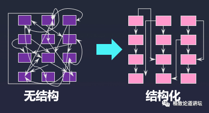 沃斯提出:程序是数据结构加算法。现在很多程序语言的数据结构和控制结构都来自PASCAL,把一团乱麻的链条式结构变成基本结构。程序由顺序、分叉、循环三个基本结构组成,就可以描述它的控制逻辑。
