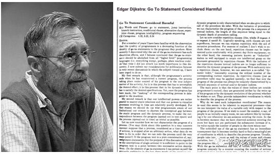 1968年,迪杰斯特拉(Dijkstra)发表著名的“GoTo语句有害论”,他说GoTo语句导致程序的静态结构和动态结构不一样,所以运行的时候出了问题也很难找得到,难以查错,程序也很难理解。因此要把GoTo语句去掉。这件事情开启了结构化的先河。