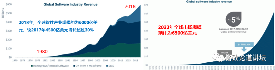 上面两张图都是讲软件过去几十年的发展。大家可以看到几乎是在爬山,数字就不详细说了。