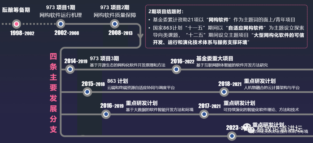 网构软件在2000年提出,到2002年就得到了国家973项目的支持,这是973项目里面第一个软件项目,我负责的项目做了2期。在这期间,基金委也支持了很多网构软件的面上项目。国家863计划在“十一五”和“十二五”期间都有以网构软件为对象的研究。