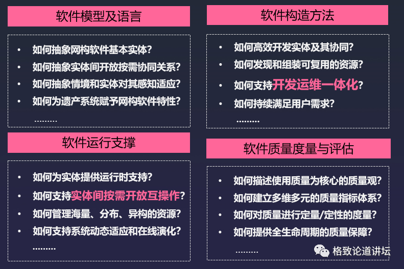 刚才谈到了模型及其语言、构造方法、运行支撑、质量评估与度量等等,我列了很多问题,但我们团队也不是所有的问题都研究。