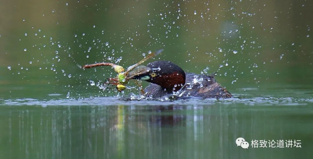 小䴙䴘对蜻蜓的认知能力比我强多了。别的种类的蜻蜓从它跟前飞过,它歇着不动;单只的碧伟蜓飞过,它只看一眼,也不动;但抱对的碧伟蜓只要一落在水面,它就直接发动攻击。一次不行两次,两次不行三次,多试几次总能成功。