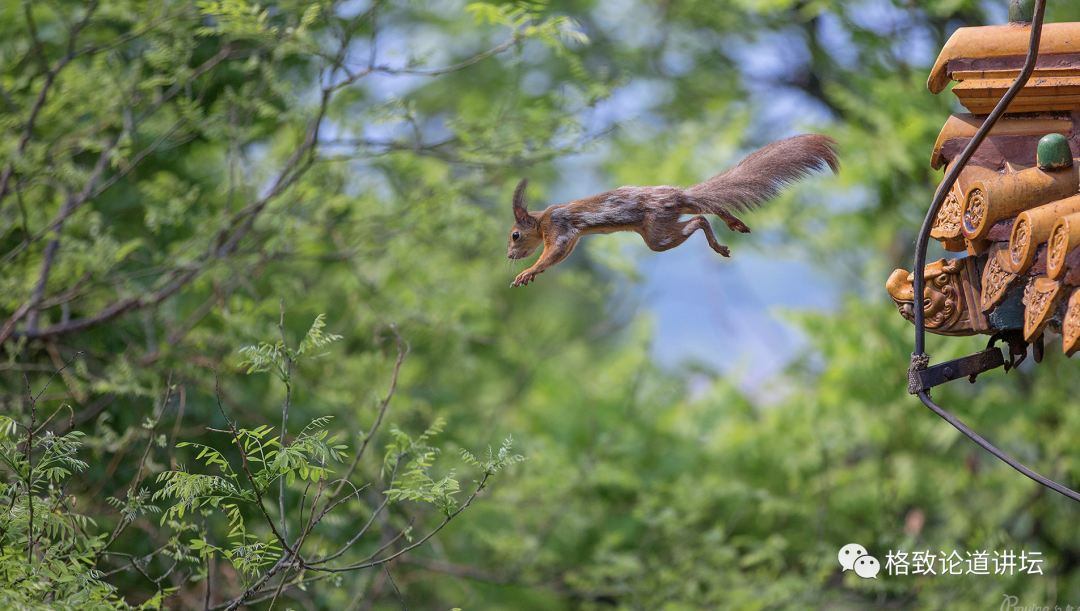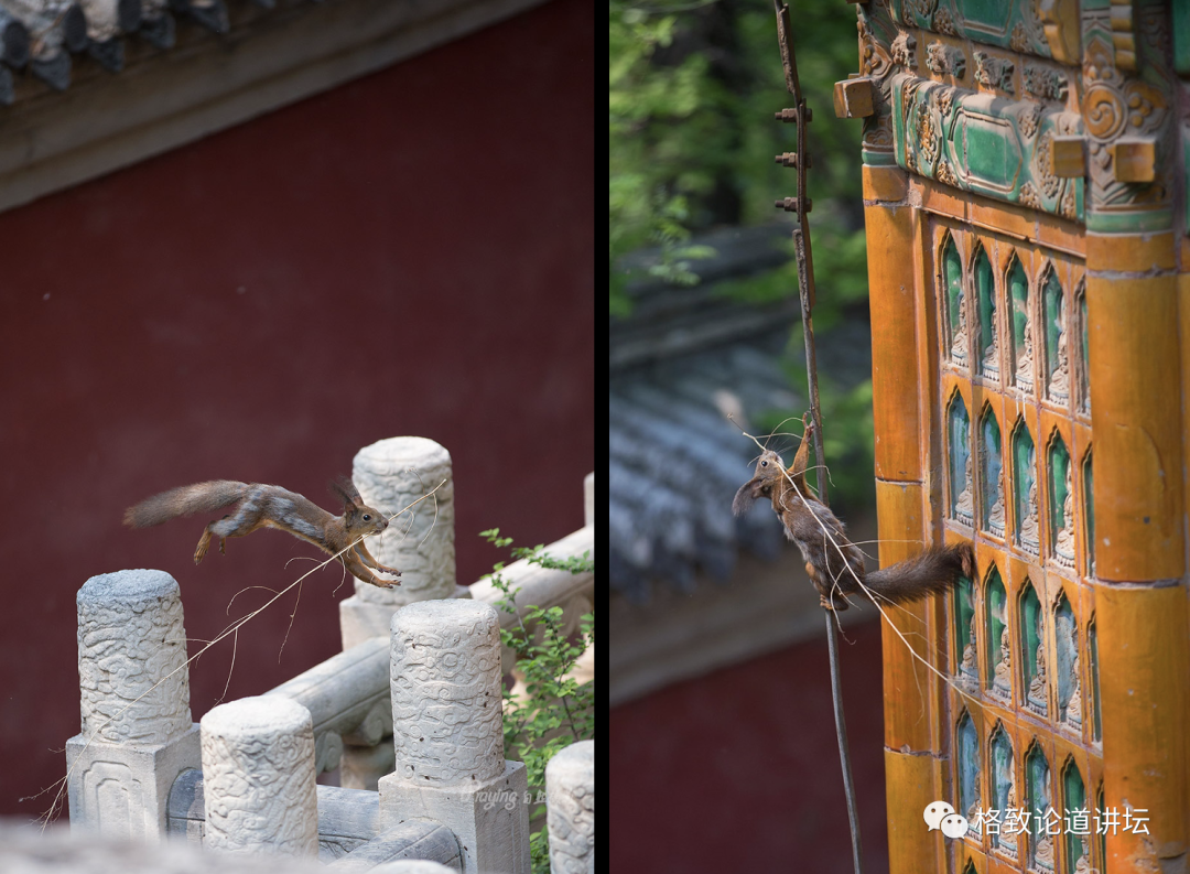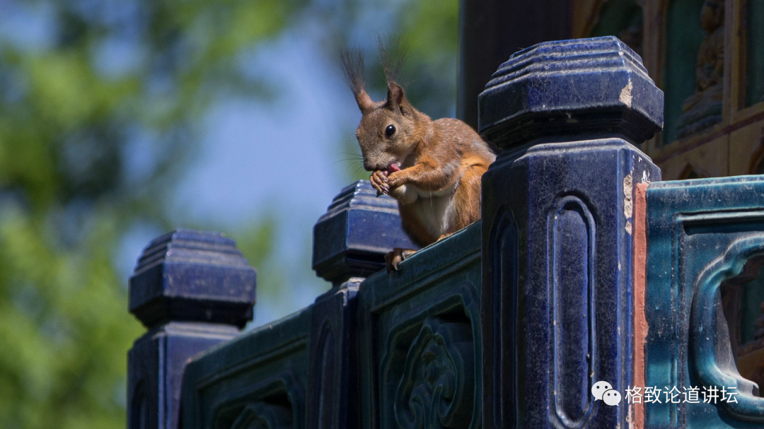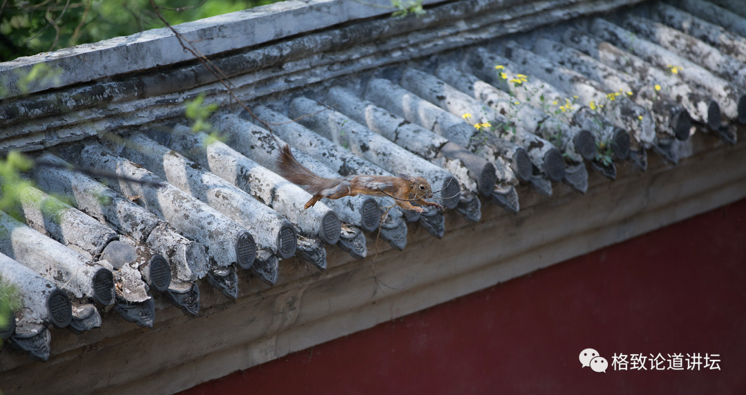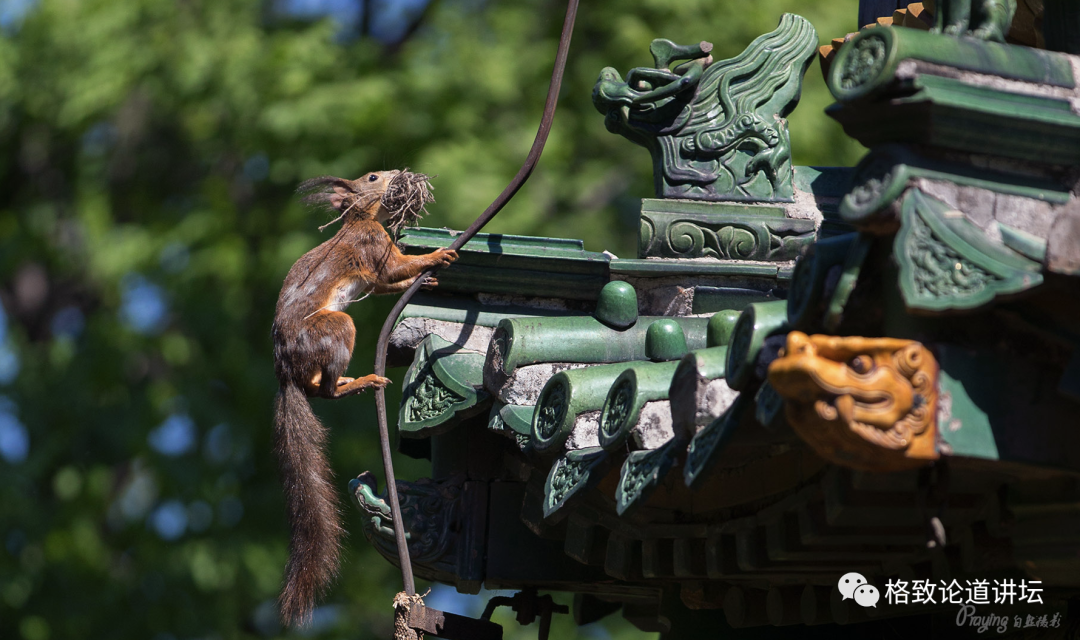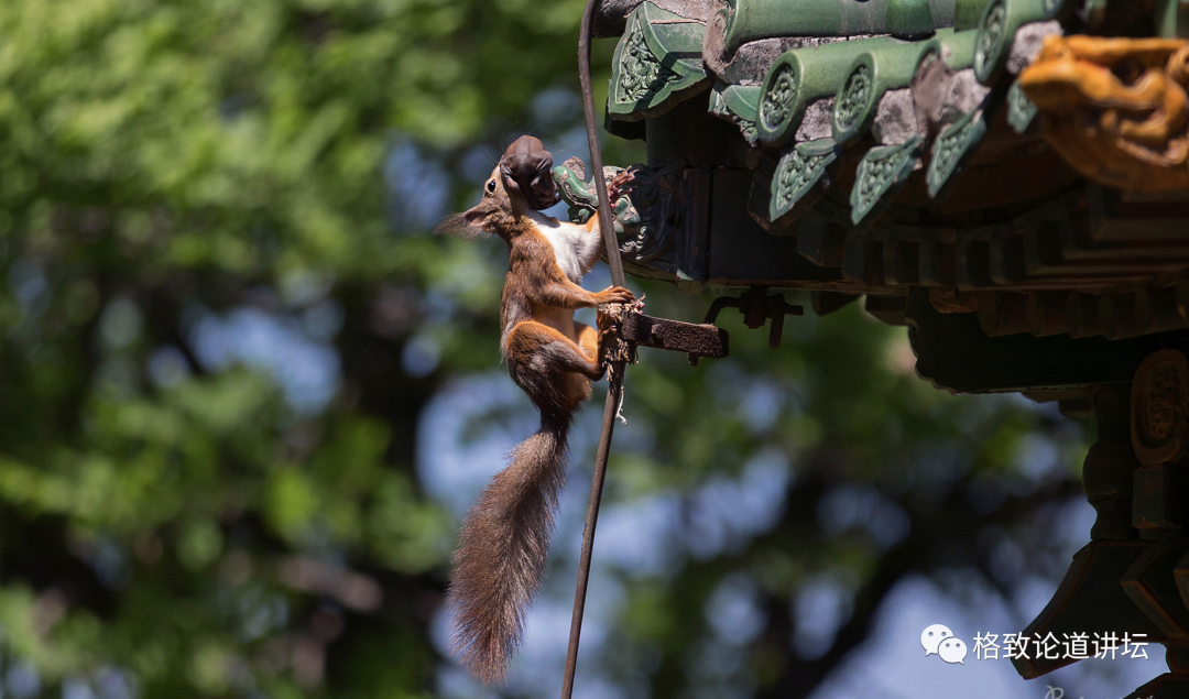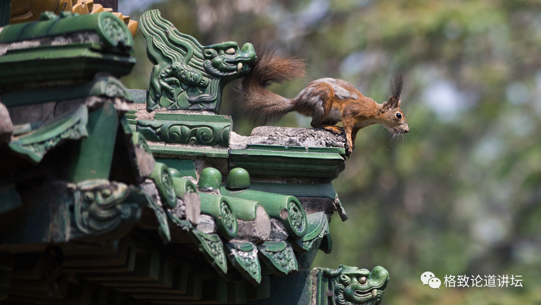 它一会儿跑到飞檐上和屋脊的神兽凑一块儿,一下跳到旁边的树冠上。这个小院很有意思,两边的树枝都伸进院里了,松鼠能从宝塔跳上树冠到小院外面。