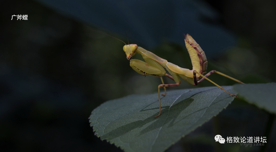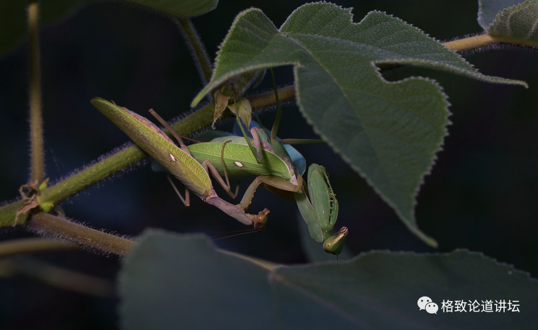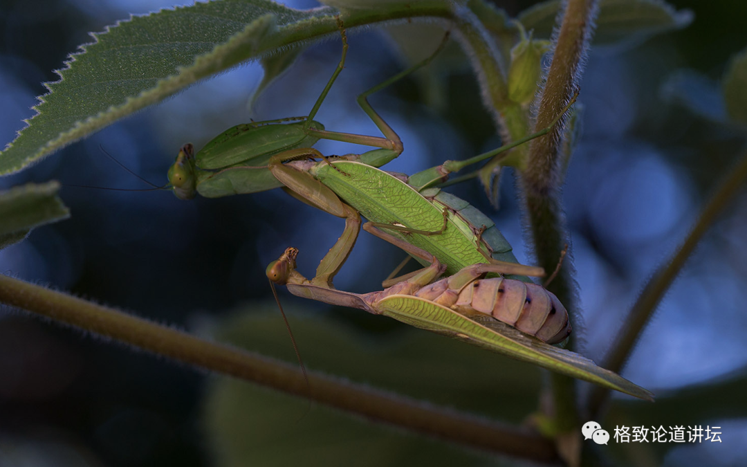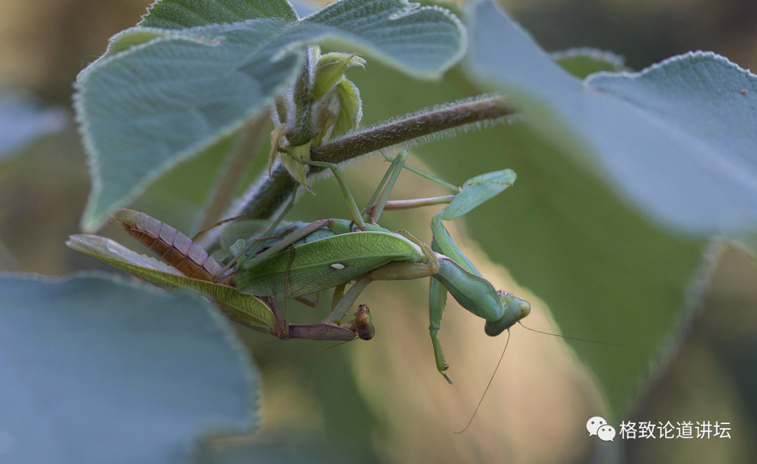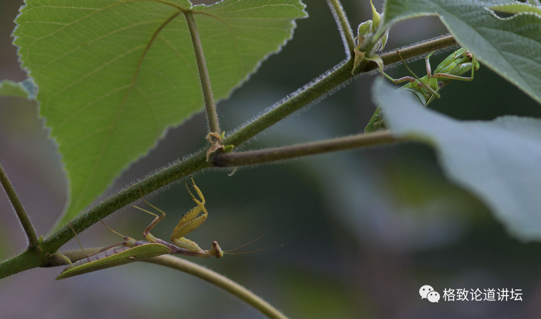我刚才说的两种动物都是比较高级的哺乳动物,大家可能会觉得低等动物肯定没那么复杂,其实一样。我再举一个螳螂的例子,这是北京分布很广的广斧螳。