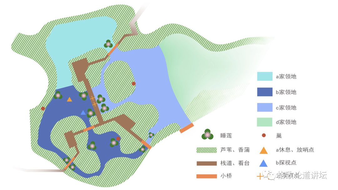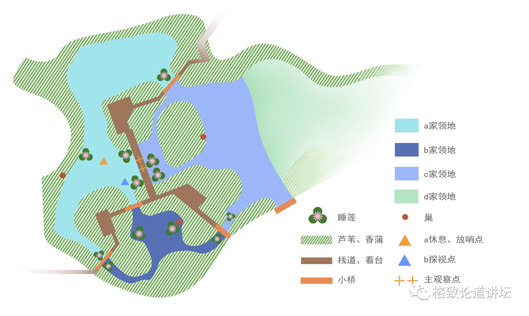 4月份,它们又开始做新巢。看下面这张图,图中红十字标注的点就是我的观察点。当时这片水域有四个䴙䴘家庭,我主要介绍A家和B家。