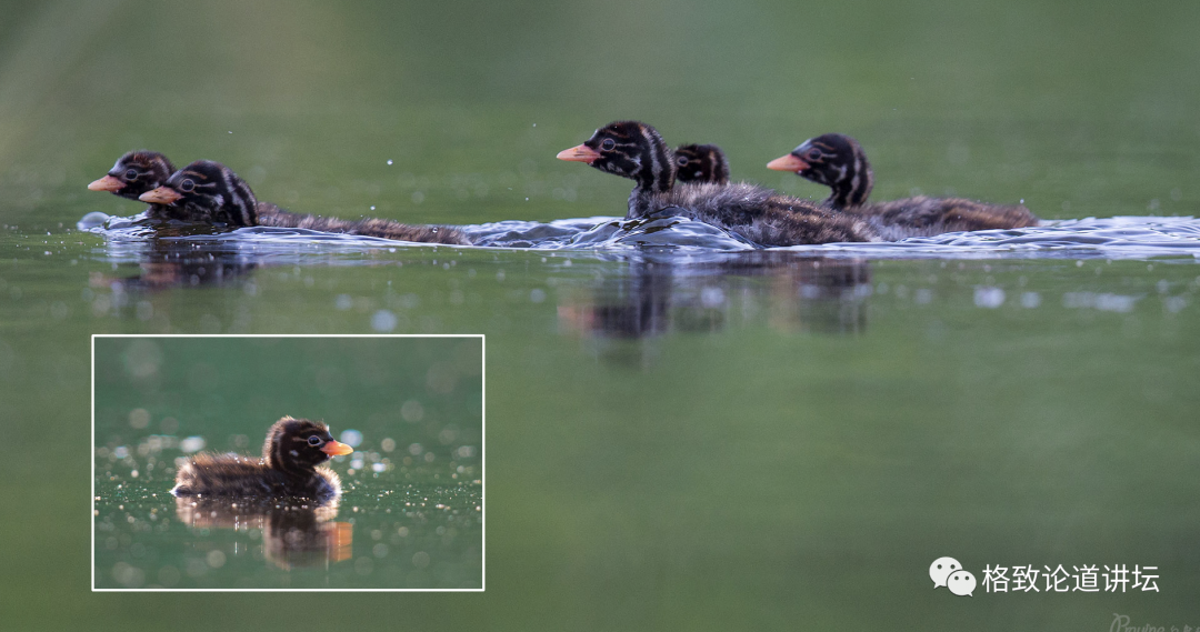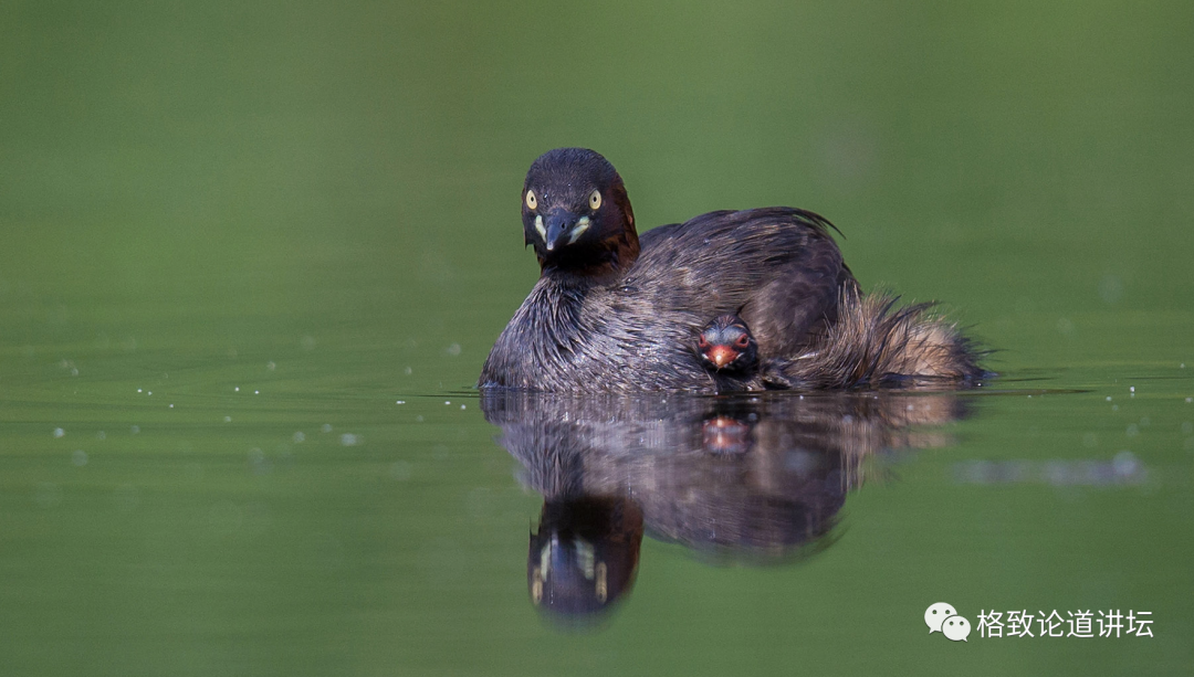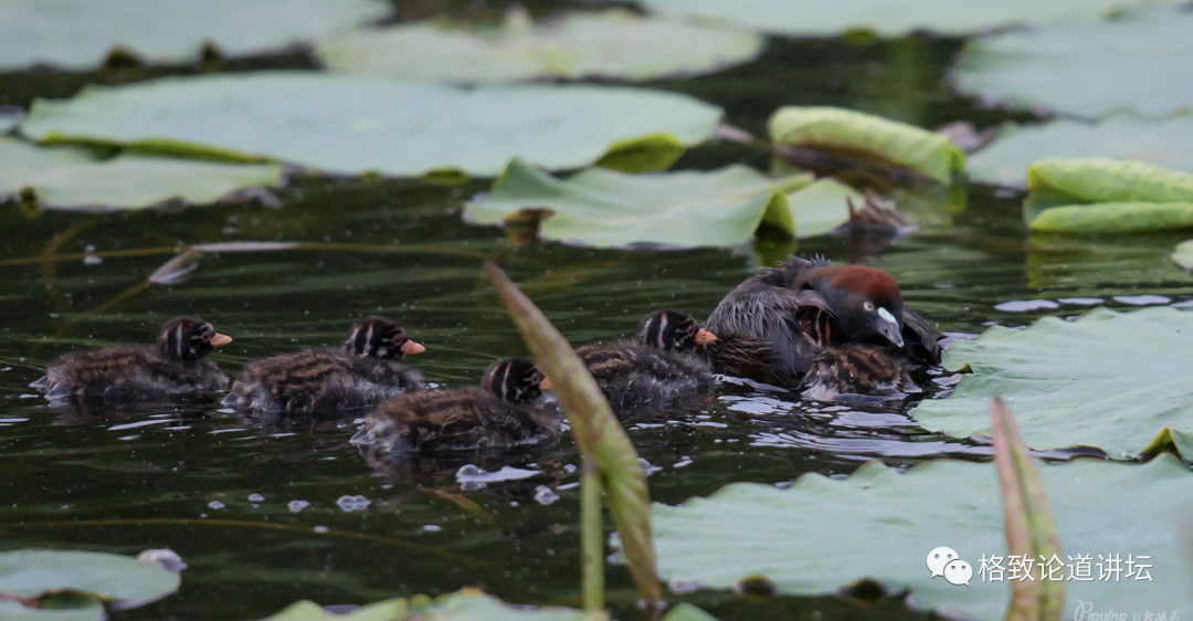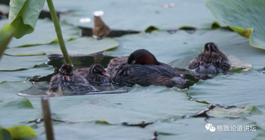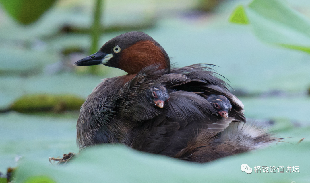 小䴙䴘带孩子更有意思。有的鸟是把孩子搁在翅膀底下护着,那小䴙䴘怎么带孩子呢?小䴙䴘是把孩子搁后背上背着,特别逗。