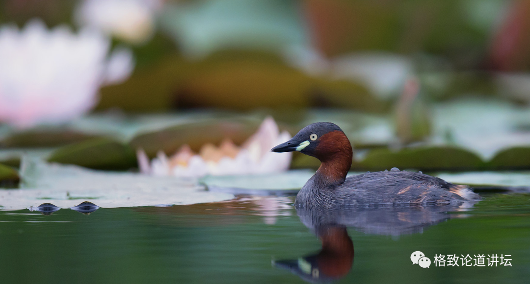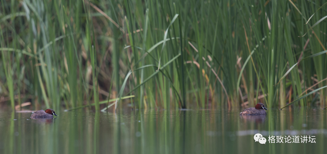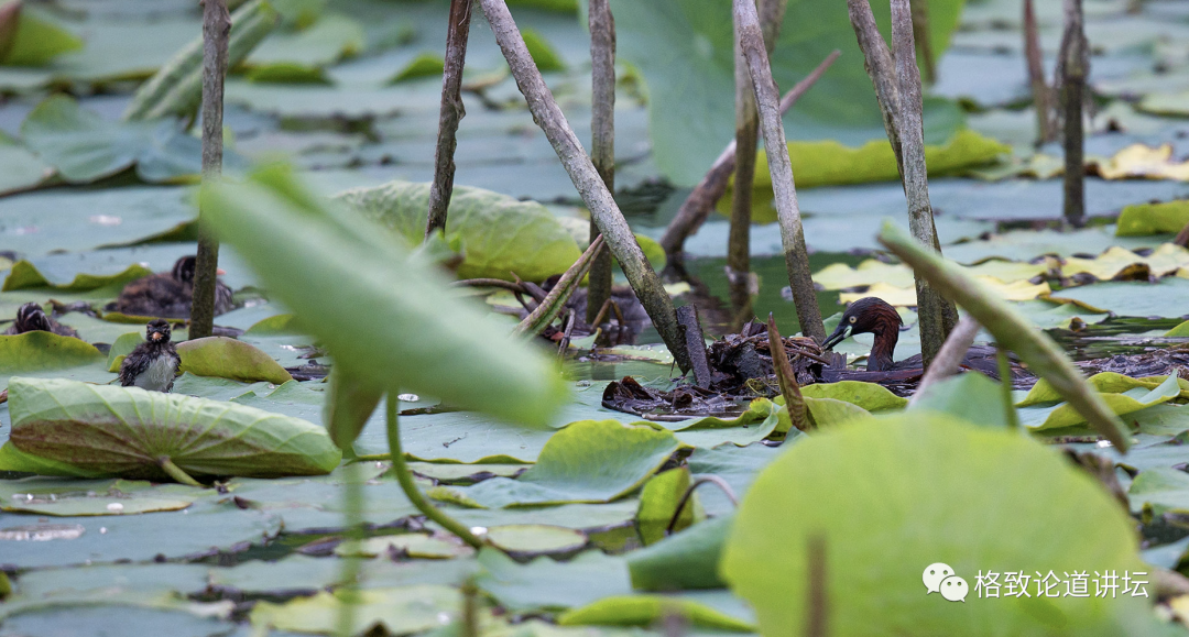 到了6月底,河塘里密密麻麻地长满了荷叶,不太方便观察。可能由于食物缺少的关系,这几个小䴙䴘家庭都没有再进行繁殖。
