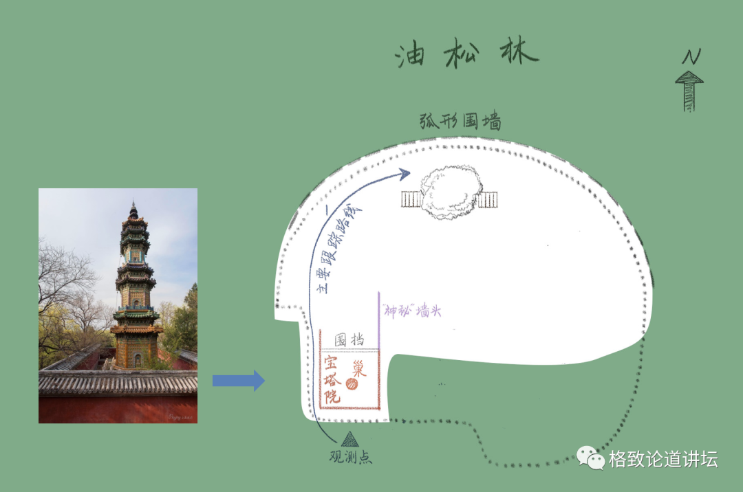 宝塔位置如图中所示。它位于颐和园万寿山的北坡,周围是一片油松林,宝塔院的北边还多出一堵墙。