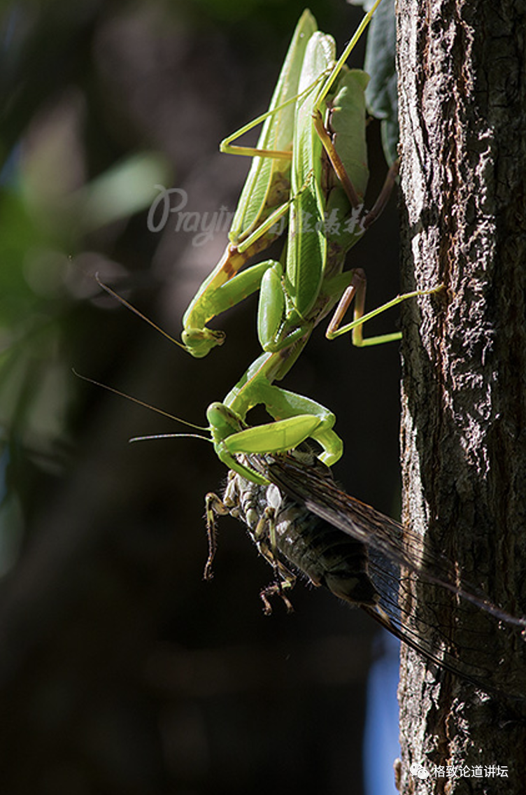 很可惜,我没看见母螳螂为什么背过身去。刚才我去观察别的动物了,我看到了一对交配的螳螂捕到了一只蝉,那也是一个精彩的瞬间。