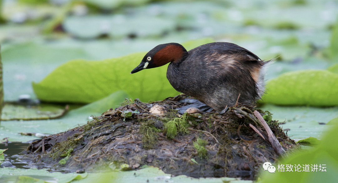 小䴙䴘的做巢方法也挺有意思:找一堆水草,将它们堆在一起,做成一个漂浮巢。刚才说了,它很难在陆地生存,所以把巢建在水上。回家的时候,从水里一蹬就上来了;出去的时候,往下一滑,就出溜下水了。