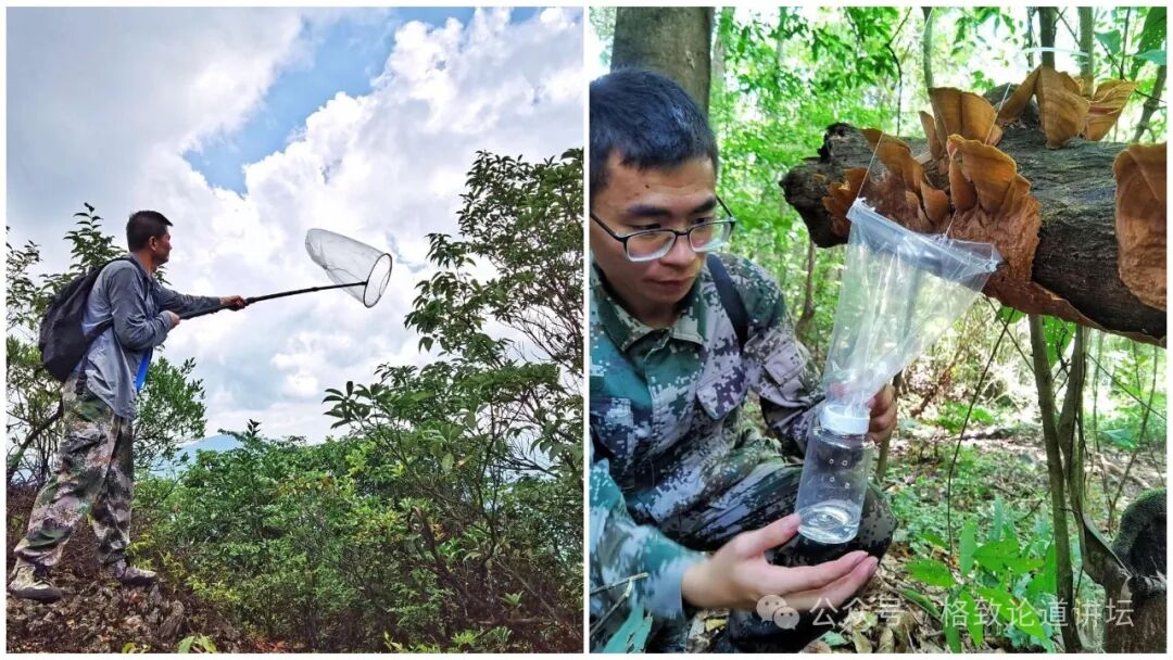 蝴蝶的监测采取了扫网的形式。右边的图片是正在进行菌食性昆虫的收集。