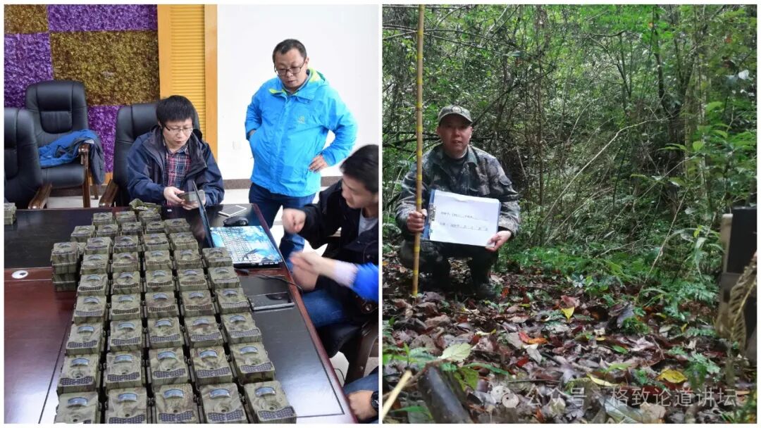 按照这样的方法,我们又购置了100台全新的红外相机。工作人员不仅有我们的同事,还招募了当地村民。在安装之前,要先培训,教他们怎么样安装和调试。安装现场有一根棍子,像右图这样,它高度是1米5,作用是确定红外相机拍摄的距离。