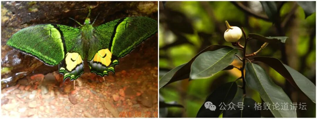 保护栖息地就是保护野生动物,很多野生动物跟植物之间是相互关系、相互依存的。比如左边是我国唯一的一级保护蝶类金斑喙凤蝶,也是世界八大名贵蝶之首。这只是雄性,是我们2015年在车八岭保护区拍的。它为什么能够出现在车八岭?通过调查,我们发现金斑喙凤蝶依赖寄主植物而生。在我们车八岭高山上就有它的寄主植物——木兰科的金叶含笑。这就是动物跟植物的相互依存。