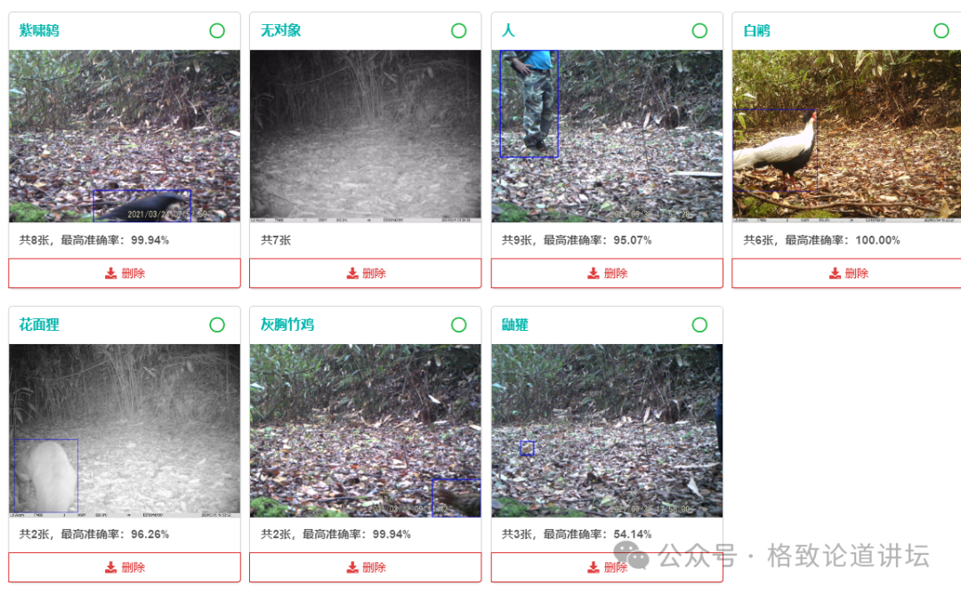 比如像紫啸鸫和白鹇,这些物种拍到的次数比较多,识别率也就非常高,白鹇识别率达到了99%。这就减少我之前讲的取回来的几万张照片后鉴定统计的工作量。