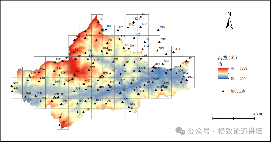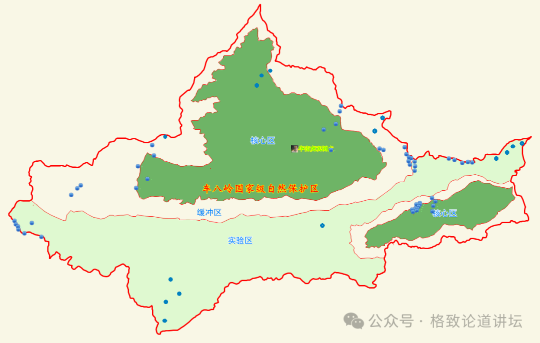 在学会红外相机的安装和使用之后,我和两位同事一起沿着海拔梯度,也就是从最低的海拔到最高的海拔,从330米到1256米,这样的100米一段的高程进行布设。因为我之前从事了12年的资源巡护,所以对山里面的情况非常熟悉,布设相机的工作也就更容易进行。图中的蓝色的点就是我们布设红外相机的点。
