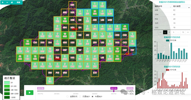 识别之后,云平台会进行关联分析,对拍摄到物种的位置分布和活动时间等进行统计。这张图上显示的是2021年度豹猫在车八岭保护区的分布情况。左边的图可以看出豹猫出现区域范围,颜色比较深的格子就是拍到豹猫次数比较多的。蓝绿色的柱状图是豹猫月度活动时间,可以看出豹猫出现最多的是6月份。右下角的红色柱状图是日间活动表,每天早上5点和半夜的时候,豹猫出现率最高。这帮我们节省了很多的工作量。