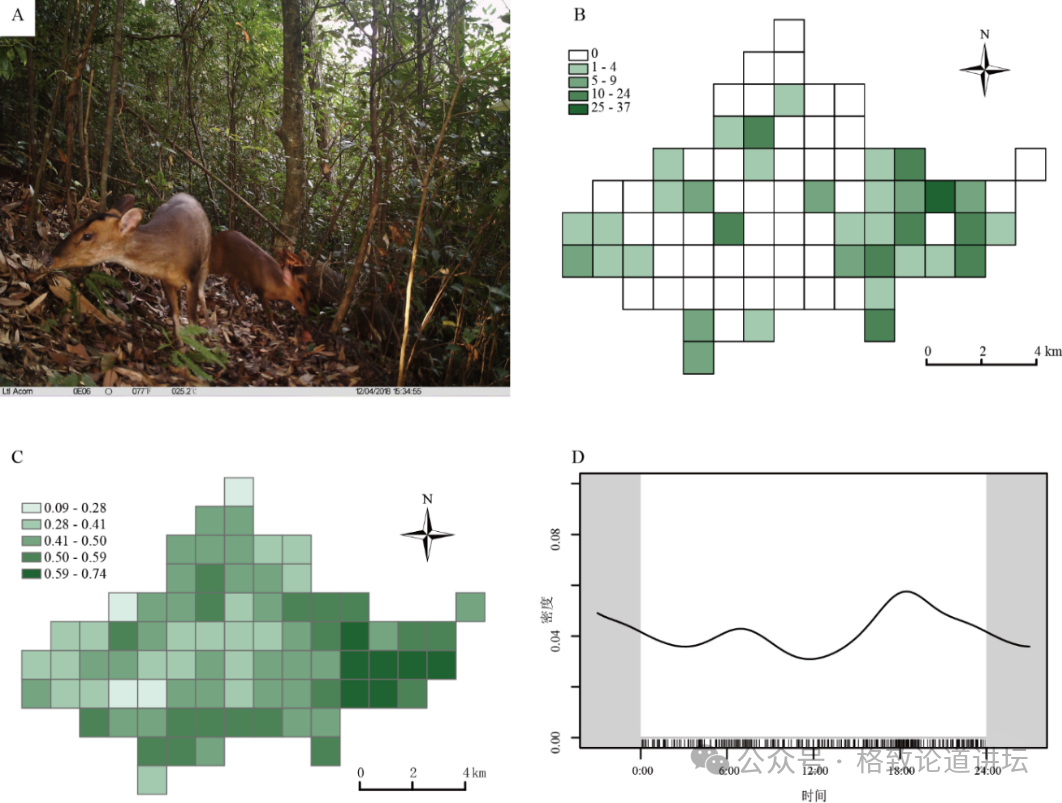公里网的设置有什么作用?在2017年的时候,我们监测到了三有保护动物小麂的出现位置和活动状况。区内的网格的颜色越深,表示小麂在该网格里被拍到的次数越多,越浅则被拍到的次数越少,白色的网格表示没有拍到。由此,我们可以一目了然整个保护区的这些物种的分布以及活动情况。