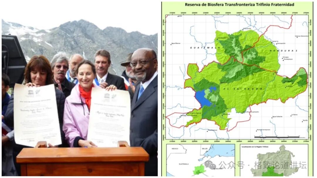 照片显示的是在教科文组织副总干事的见证下,意大利和法国的两位部长在阿尔卑斯山建立了一个跨界的生物多样性保护区。右边的地图是地跨美洲三个国家危地马拉、洪都拉斯、萨尔瓦多的特里菲尼奥(Trifinio)跨境生物圈保护区,是我在临卸任以前助力推动的一个项目。