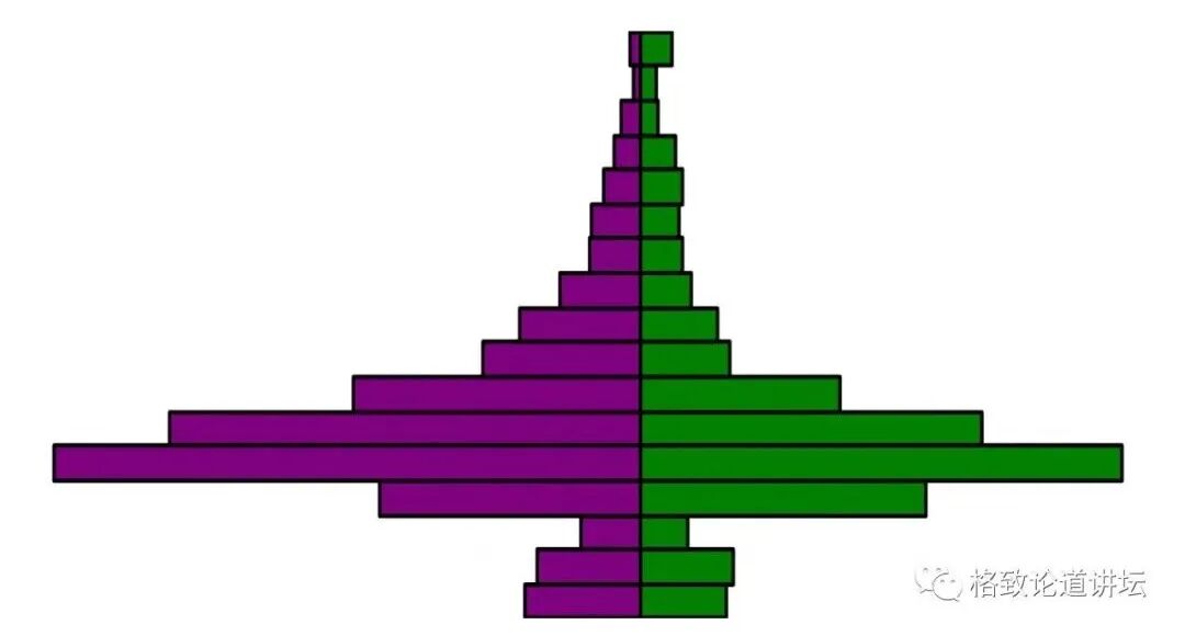 下图是我们人口学上经常用的一个图,很简单,就是把人按照年龄大小分类,低年龄组的放在下面,高年龄组的放在上面,男的放在左边,女的放在右边,把它画出来。它叫作人口年龄结构的金字塔,因为大多数国家的人口年龄结构的形状都是这样一个金字塔的形状。