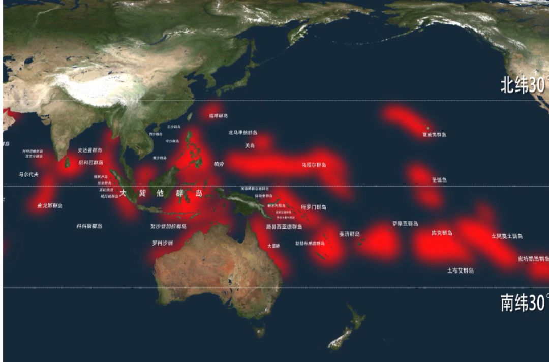 珊瑚礁主要分布在浅海热带,也就是南北纬30度之间,图中的红色区域。我们国家的珊瑚礁主要分布在我国的南海,最北到福建的东山,香港也有。但这里的造礁石珊瑚不能成礁,因为在北部的边缘,只称之为造礁石珊瑚的群落。