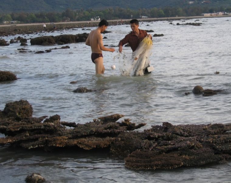 但我们国家跟全球不一样,全球是厄尔尼诺,全球变暖引起的,而我国主要是什么?人类破坏。过度的渔业和沿岸的开发,沉积物、污染物的排放,还有酷鱼滥捕。这两张图片,一张是炸鱼,一张是在礁盘里用流刺网。