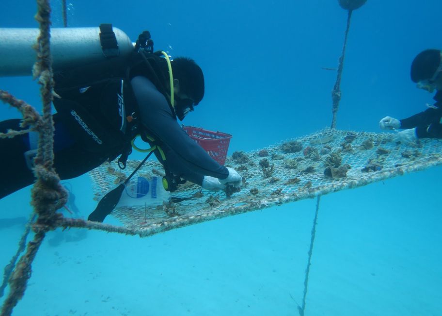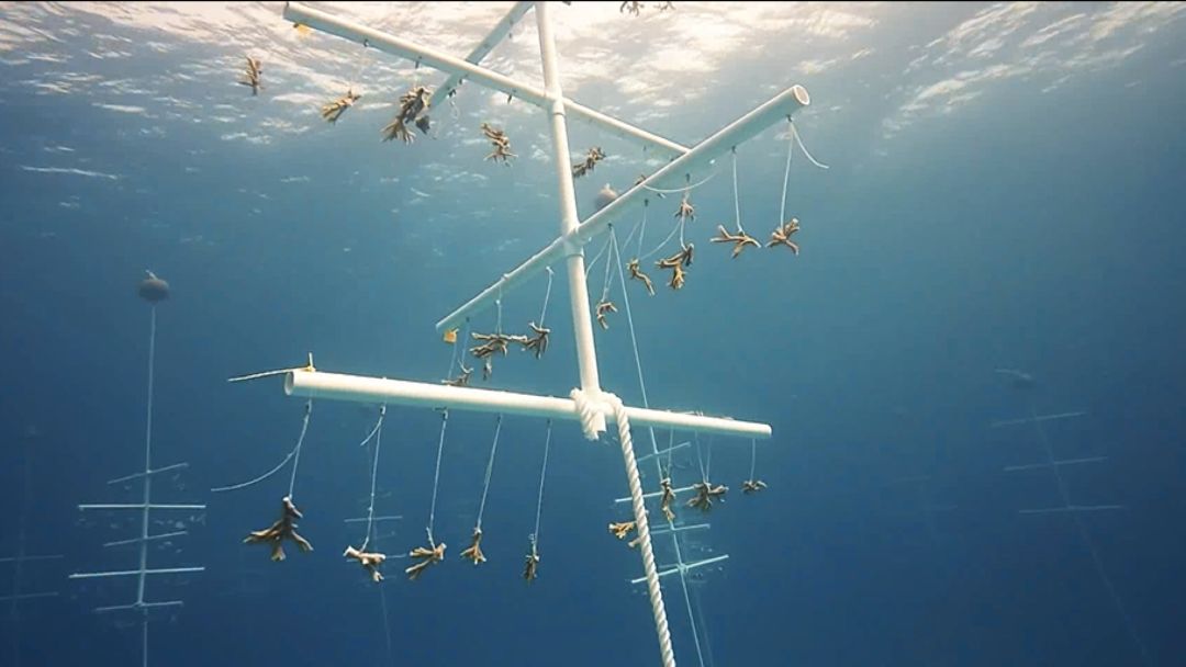 面对珊瑚礁目前的状况,我们也在思考,应该做些什么?人类破坏造成它的退化,我们也应该为珊瑚礁做一点事情。我自己的水产养殖背景到这里发挥了作用。我们开始了修复珊瑚礁技术的研发,开始研究苗圃的建设。