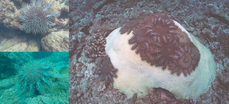 一个长棘海星一天能吃两平方米的珊瑚,它不喜欢吃中间这块白的——筒星珊瑚,把周边全部吃光后就剩下这一块了,我们叫“最后的晚餐”。几十只长棘海星趴在上面,每次看到这个照片我都毛骨悚然。