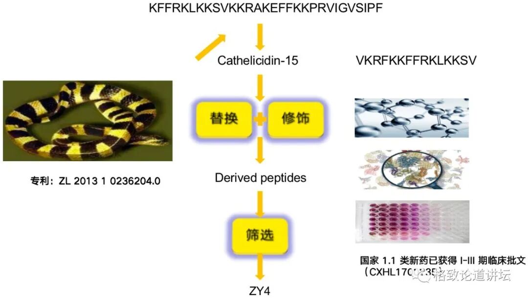 不过,我们还希望能获得活性更好、能特异性治疗某种疾病的药物。因此,考虑到生产的成本,我们先将这条毒素变得短小了。如果毒素越来越长,生产的代价也会越来越大。接着,我们以BF30为模板,进行了替换和修饰,最终得到了一个多肽分子,并命名为ZY4。
