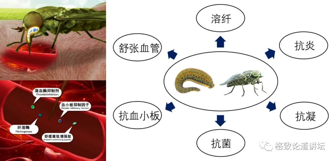 以蚂蟥、牛虻为代表的吸血动物们在吸血时,也会在唾液里分泌大量的活性多肽,阻止血液凝固,从而延长它们的吸血时间。我们在它们的唾液腺里获取了大量的活性多肽:抗血小板多肽、抗凝血因子多肽等等。这些多肽可以为研发治疗脑血栓、心肌梗死等心脑血管疾病的药物提供先导分子。
