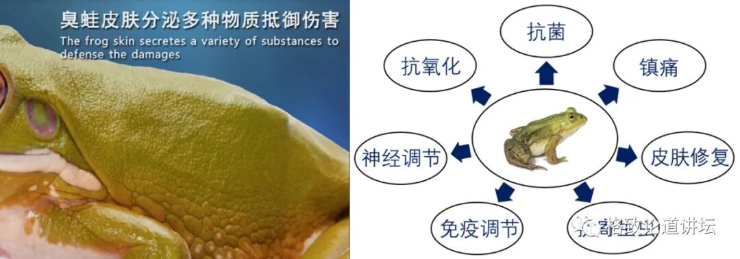 两栖类如蛙或蟾蜍,它们的皮肤是裸露的,没有鳞片或毛发,还时常受到来自天敌、紫外线和微生物的侵害。但是,它们的皮肤会分泌大量的活性多肽,包括抗紫外线的抗氧化肽、抗菌的抗菌肽、不让伤口留疤的皮肤修复肽等等。我们在两栖动物的皮肤中提取出了60多个家族、500多条活性多肽,而这些活性多肽有望为我们研发抗氧化、抗菌抗炎、镇痛、皮肤修复等多类药物提供新的思路。