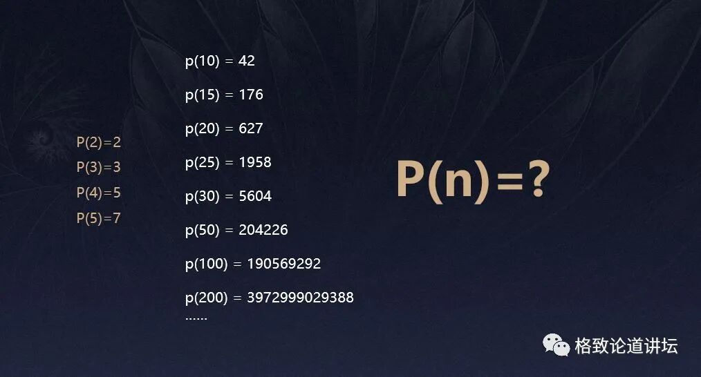 再看一下数字,P(2)等于2,P(3)等于3,P(4)等于5,P(5)等于7,P(10)等于42。可以看到P(100)已经很大,而到P(200)那就更大了。看了这组数据以后,你可能会说增长太快了,没法数。