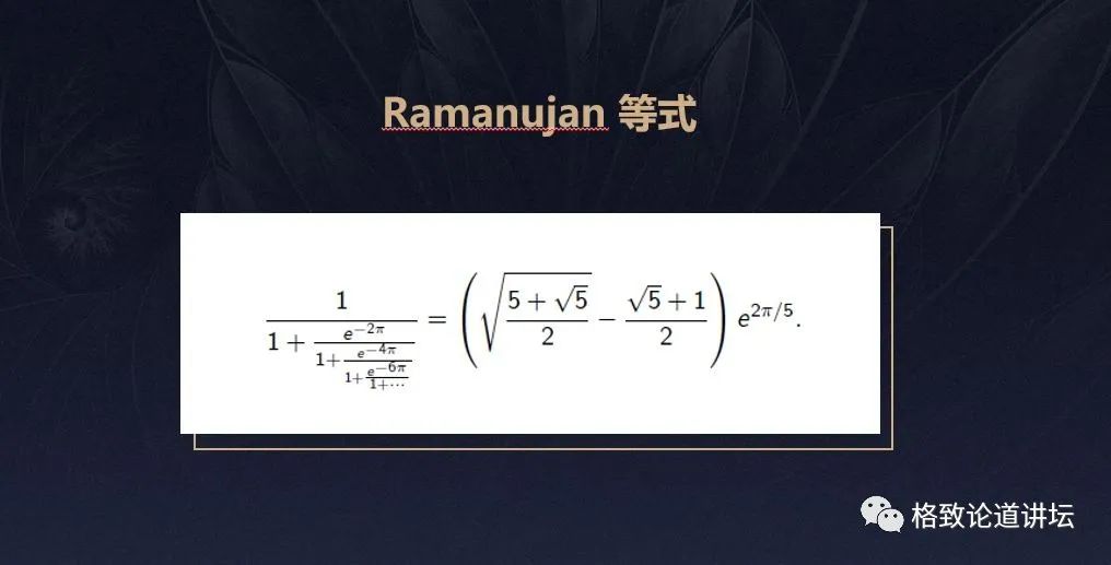 左边是个无穷的连分式,而右边却是个简洁的初等表达式。Hardy看到后说:“它完全击溃了我,我之前一点也没有看过这样的东西,只有一流的数学家才能写出来!”,这就是让人眼前一亮的数学。