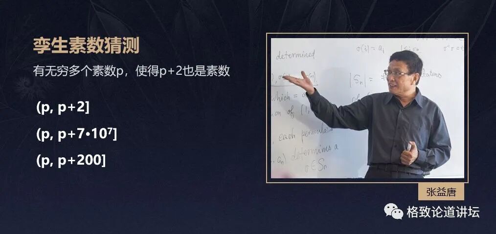 2013年,华人数学家张益唐证明了:存在无穷多个素数,使得从p到p加7000万这个区间内也含素数。这是数论领域里面一项革命性的工作。