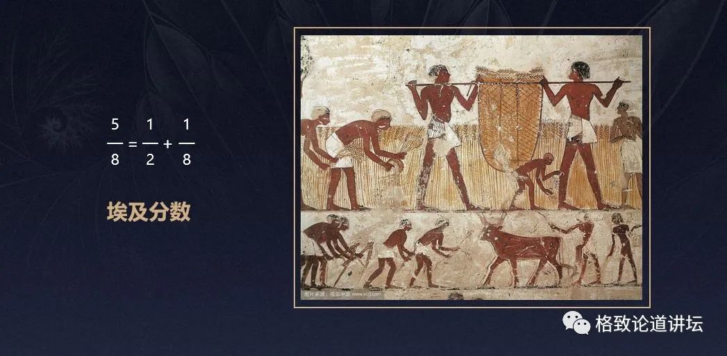 这是古埃及人刺在一种不易腐烂的树叶上的分配方案,由考古学家发现的。用现代数学表示,就是5/8等于1/2加1/8。它就是一个埃及分数,即一个数是有限个分子为1的分数之和。古埃及人在这样的分配方案中,意识到了素数的特性。