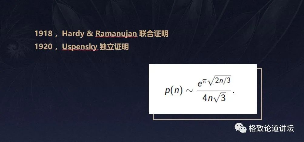 这个结果是猜不出来的。他们是用了数论里面的圆法,经过复杂的计算得到的。他们做出了别人难以想象的结果。分割函数也常出现在量子物理中。