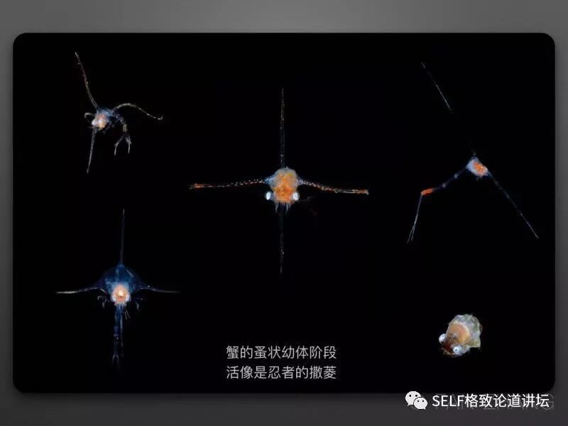 除了这些几乎没有什么行动能力的生物以外,我们还可以找到一些动作稍微快一点的,比如十足目的虾和蟹的幼体。我们平时吃的皮皮虾、螃蟹都会经历浮游生物的阶段。在这个阶段,它们非常弱小,但还是有防卫能力的。