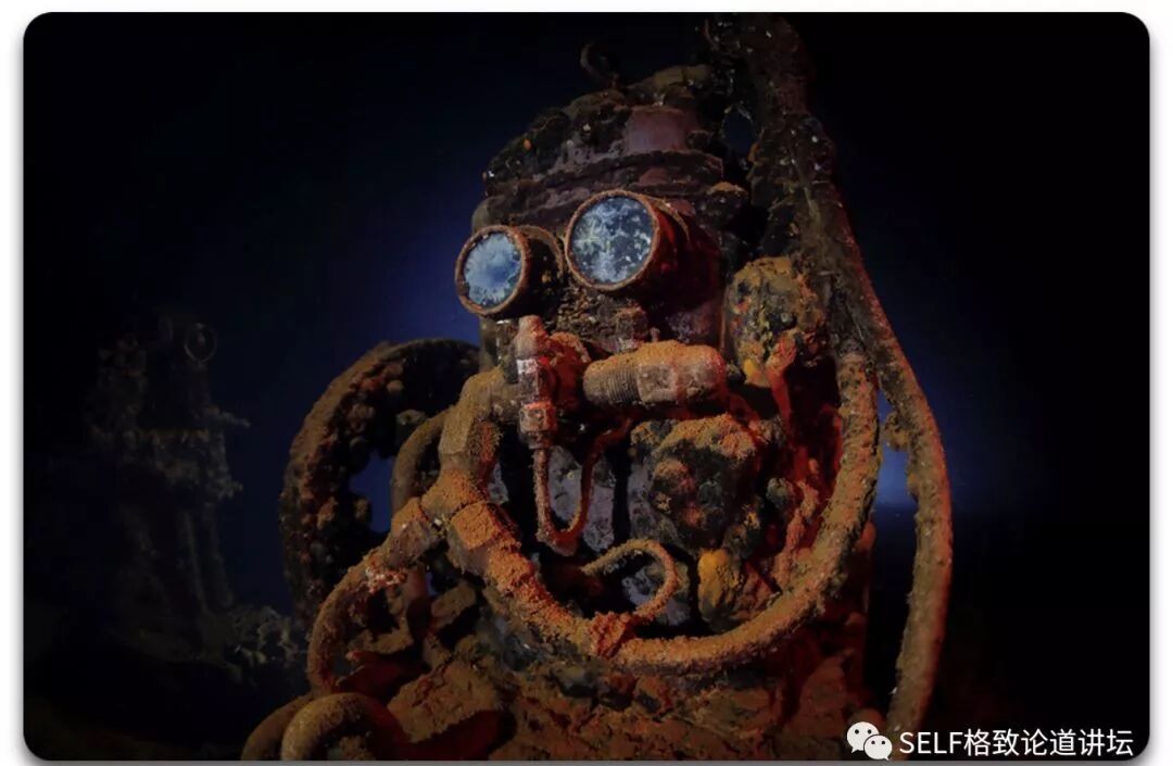 这是我在一艘二战沉船里面拍摄的车床,看起来很像是一个面罩或是变形金刚,当时我是用一种特殊的灯光把它表现出来的。