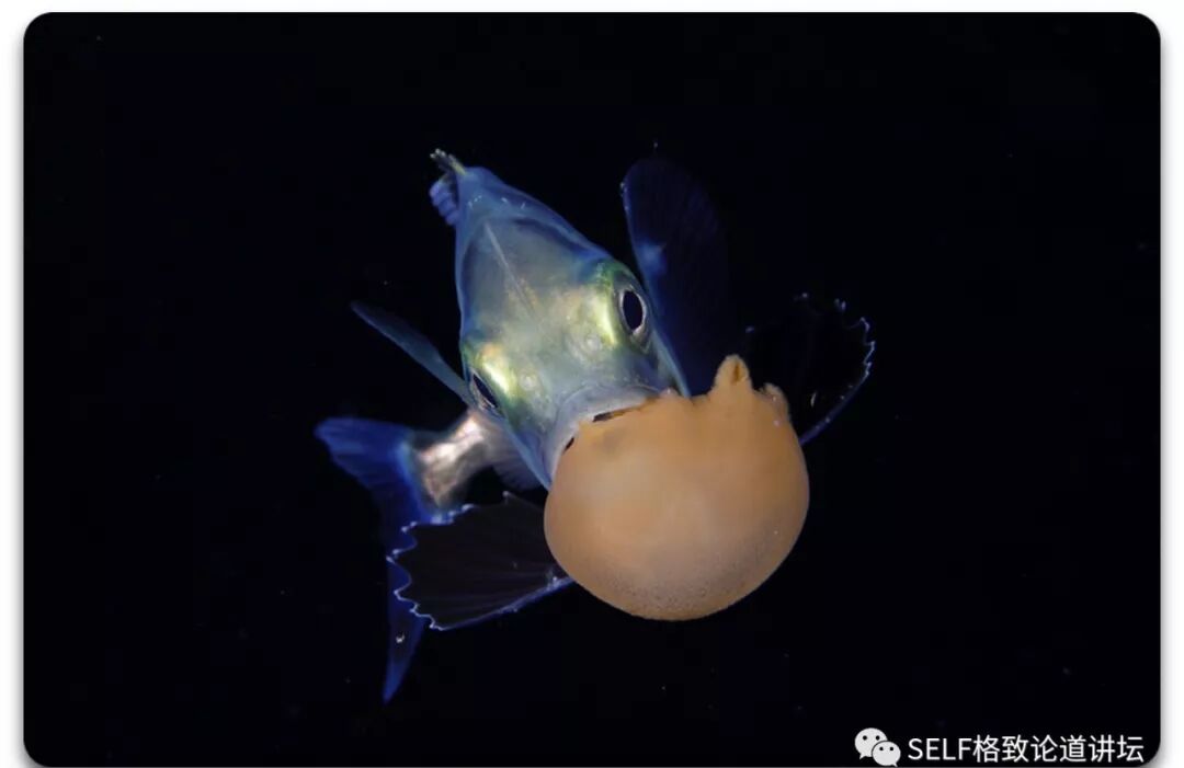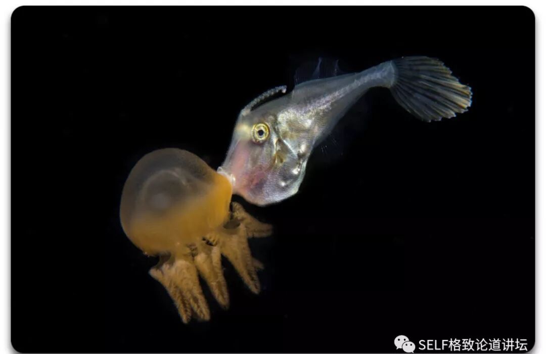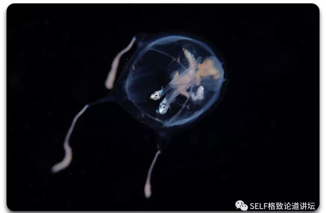 我这时候意识到鱼跟水母都是小时候的状态,当鱼跟水母长大以后,水母会比鱼大很多,这个时候鱼会整个钻到水母里面,就有了我们一开始看到的景象。