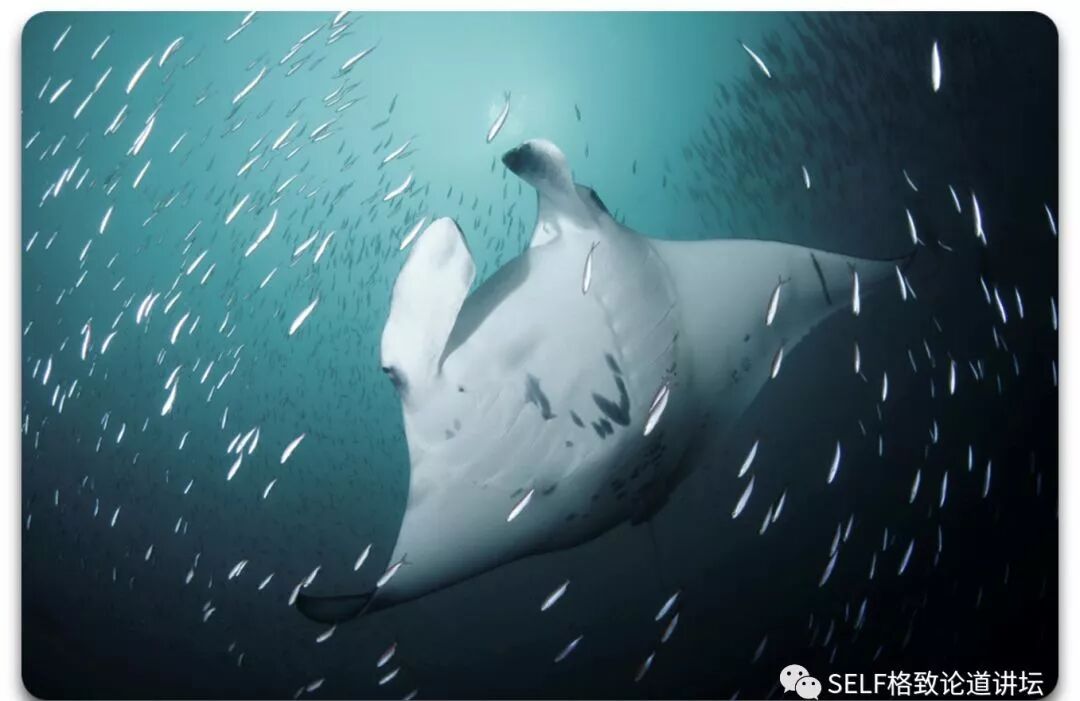 除了刚才所说的统称为浮游生物的类群,我们还可以看到很多捕食者,包括各种大型的鱼类,比如鲨鱼、蝠鲼、章鱼、乌贼、鱿鱼等。