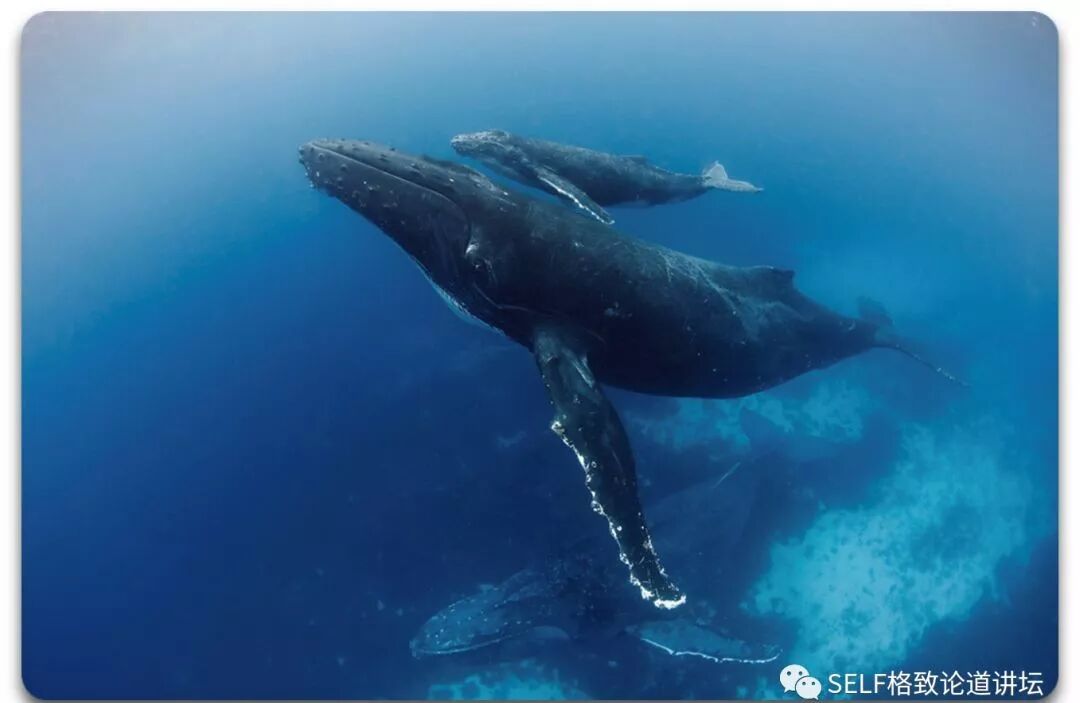 这张图看起来其乐融融,一头巨大的母鲸带着它的小鲸,旁边还有一个捍卫者。这个捍卫者其实并不是小鲸的爸爸,因为小鲸的爸爸在交配之后会马上离开,陪伴着母鲸和小鲸的是其他公鲸。