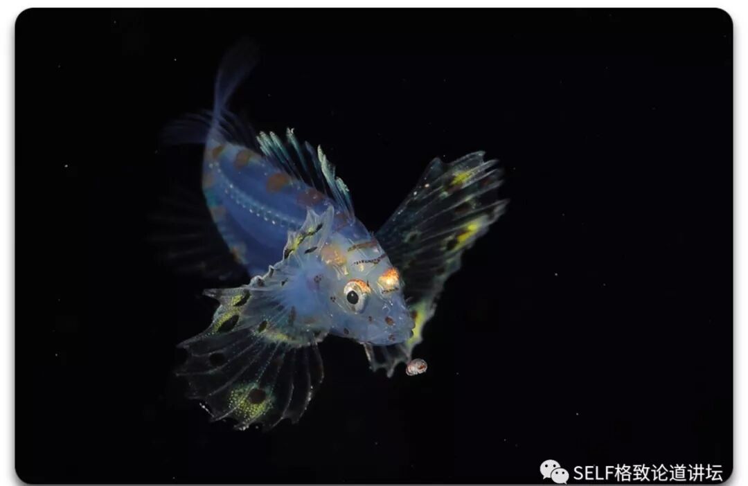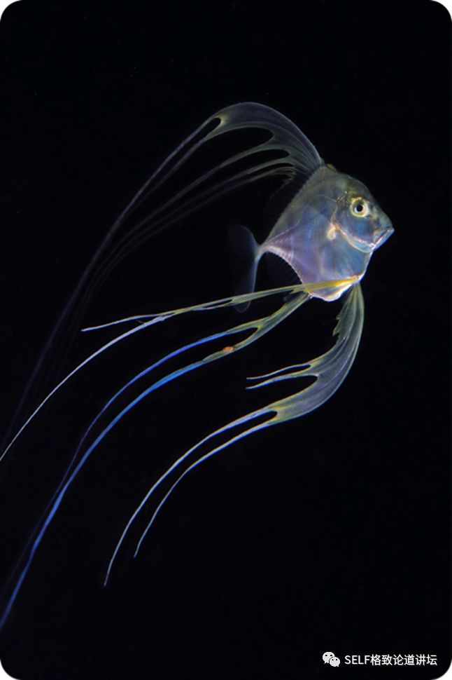 这是鳗鱼的叶状幼体,它的骨骼和肌肉没有发育完全之前,整个是通体透明的,这时候它的游动非常魔幻。用灯照着它的时候,你会看到它游动留下来的这种残轨。