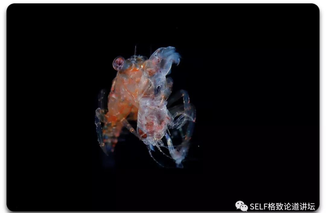 我们吃的龙虾小时候也非常华丽,这是龙虾的叶状幼体,它有时候不满足搭着一只水母,甚至一只脚上搭一只水母,不知道它应该跟着哪只水母走。