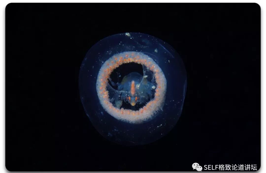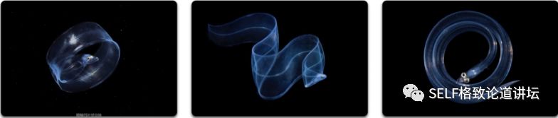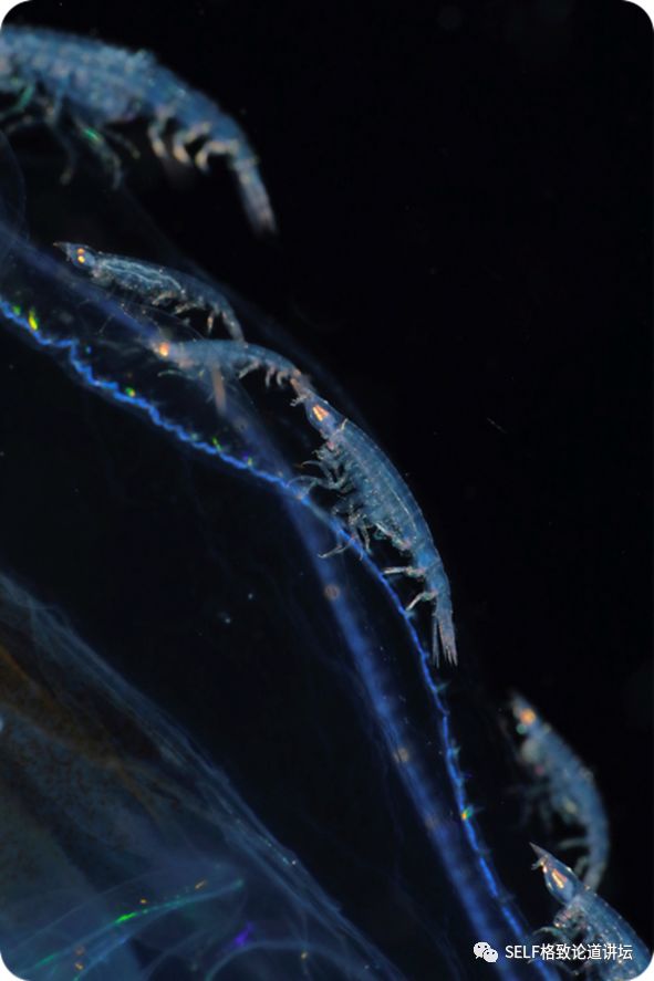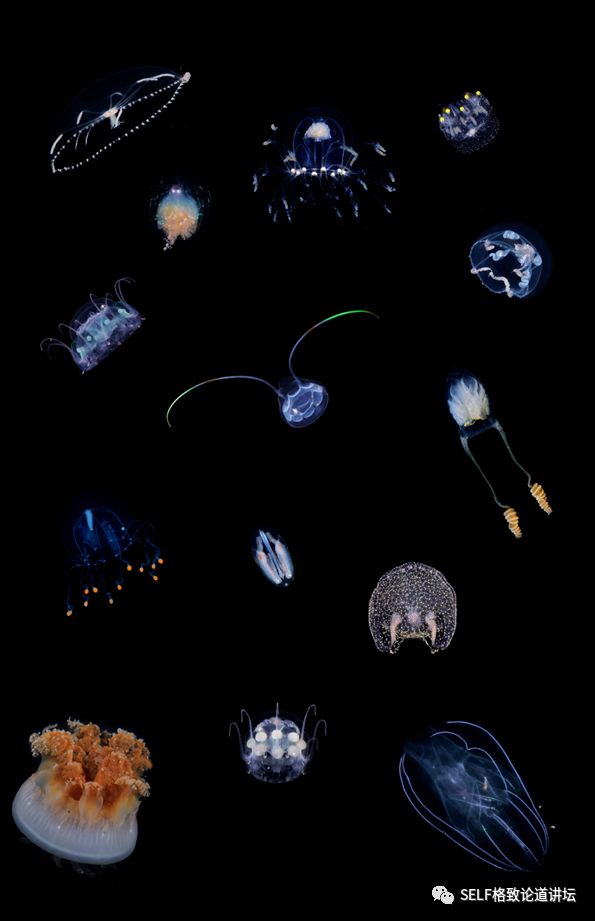 除了贝类,我们还可以看到很多水母,这些水母跟我们心目中想象的水母可能不太一样,并不是金色的一坨漂来漂去的。它可能非常长,放射着七彩的光芒。有很多水母非常小,只有1厘米长,像一个小的吊灯。