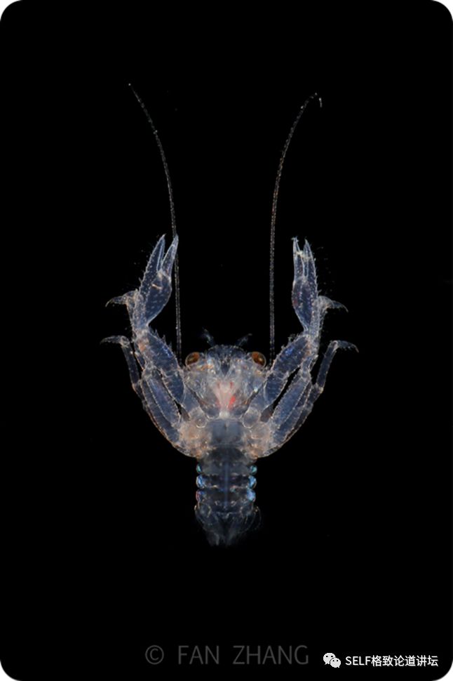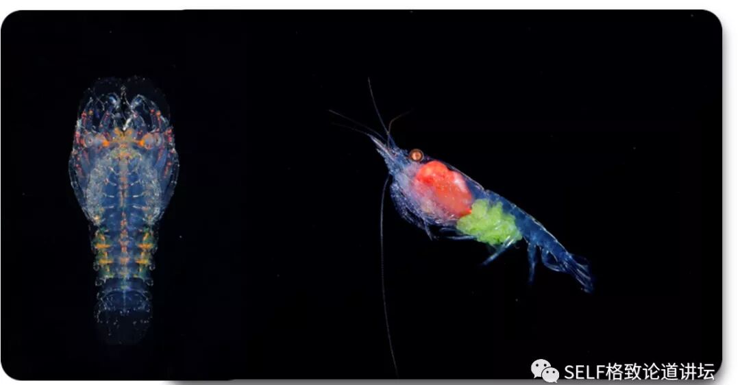 左图是一种龙虾的幼体,成体很普通,长得像只拖鞋,但是小时候的颜色特别艳丽。右图是一种浮游的虾成体,为什么说是成体呢?鲜艳的绿色部分是它的卵。