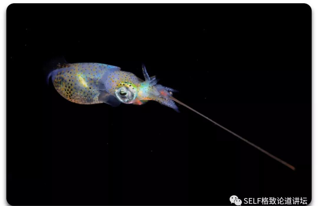 视频中依次出现的是长臂章鱼、鳗鱼的叶状幼体和莱氏拟乌贼,莱氏拟乌贼是我们平时吃的鱿鱼干的主要来源。视频中还有带着一个壳的远洋的章鱼、海蛇以及伪装成蛇的鳚鱼。